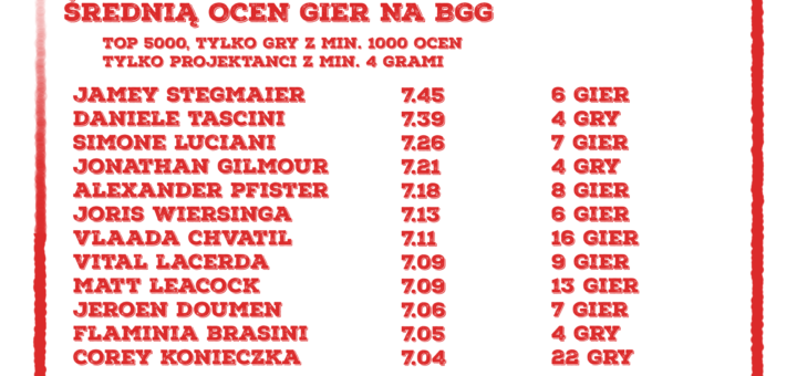 Trzeci pakiecik statystyk, które wrzucałem na FB. Sprowokowała mnie dyskusja spowodowana poprzednim wpisem. Padła tam sugestia, że najlepszy jest Jens Drögemüller, bo ma dwie z trzech swoich gier w Top 20 BGG. Uznałem, że...